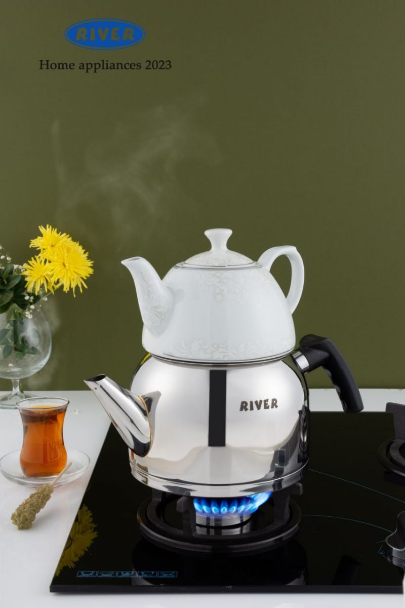 کتری قوری استیل ریور با طراحی فوق العاده زیبا و کیفیت بالایی که دارد از محصولات پرفروش کالای آشپزخانه برند ریور می باشد. کتری این ست از جنس استیل باکیفیت می باشد که بدلیل دارا بودن خاصیت نگیر بودن استیل( ضدزنگ) می توانید با خیالی راحت از این سرویس برای سال ها استفاده نمایید.